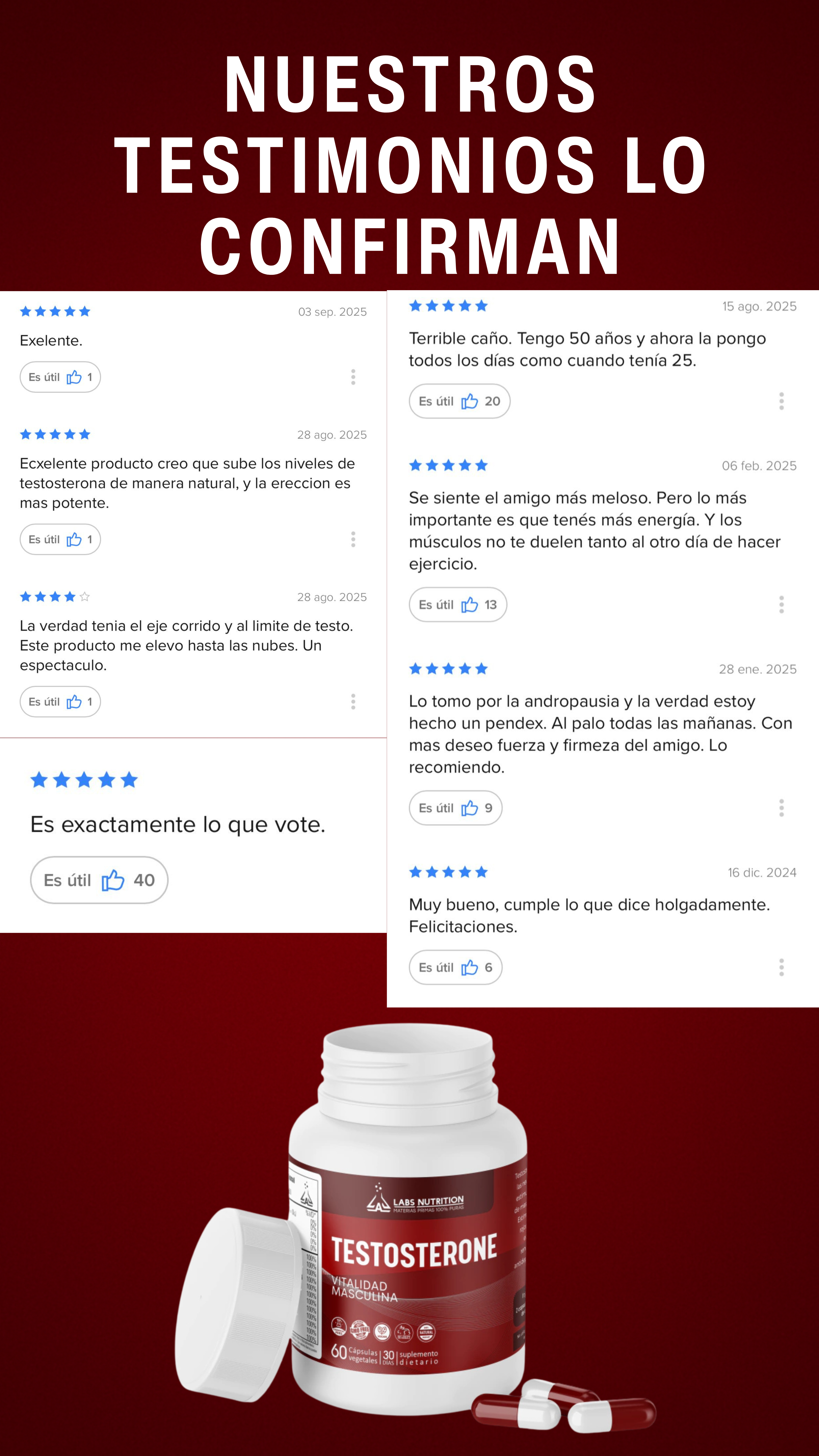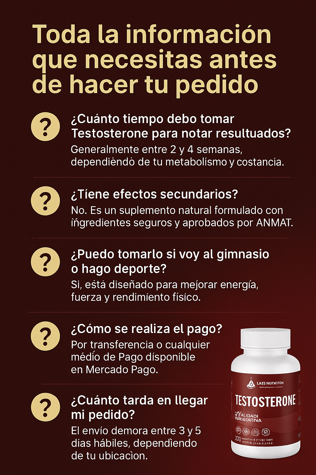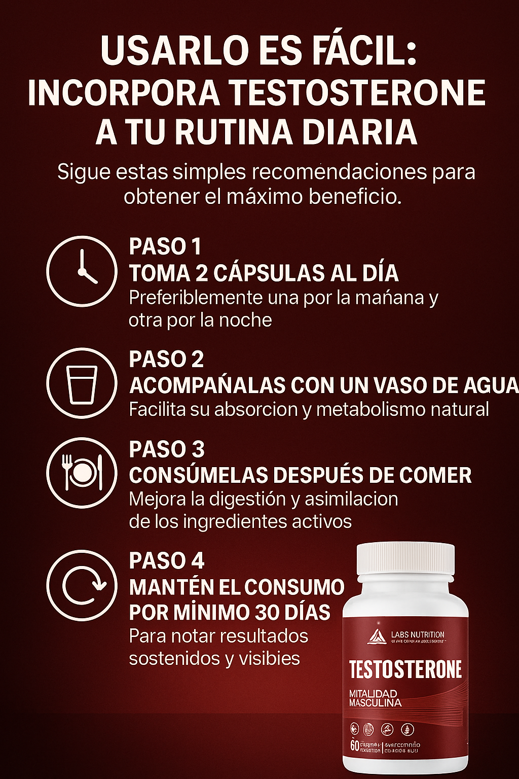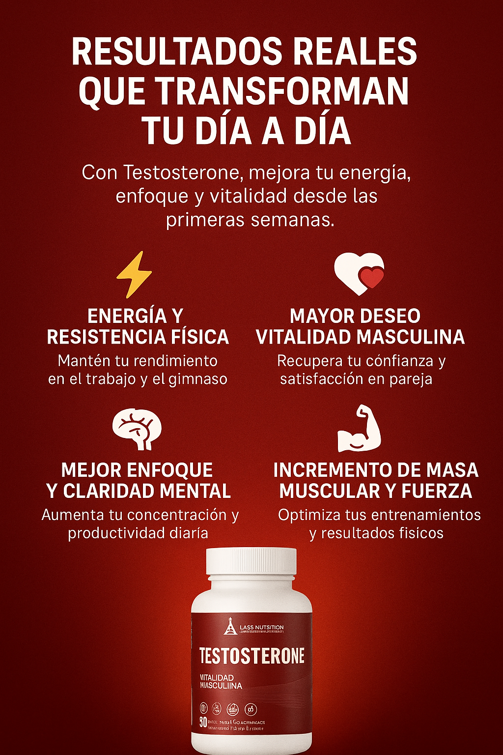 Testosterone es un suplemento Pre-hormonal, está compuesto por sustancias y nutrientes naturales que estimulan la producción hormonal natural del cuerpo, incentivando al organismo a que trabaje para ayudar a convertir y promover la generación de la Testosterona Biológica Natural.